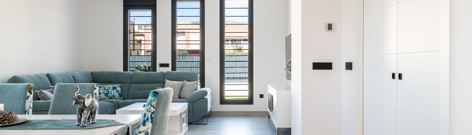 Este llamativo chalet de formas actuales cuenta con unas instalaciones de calidad, entre las que destacan sus cerramientos de PVC.