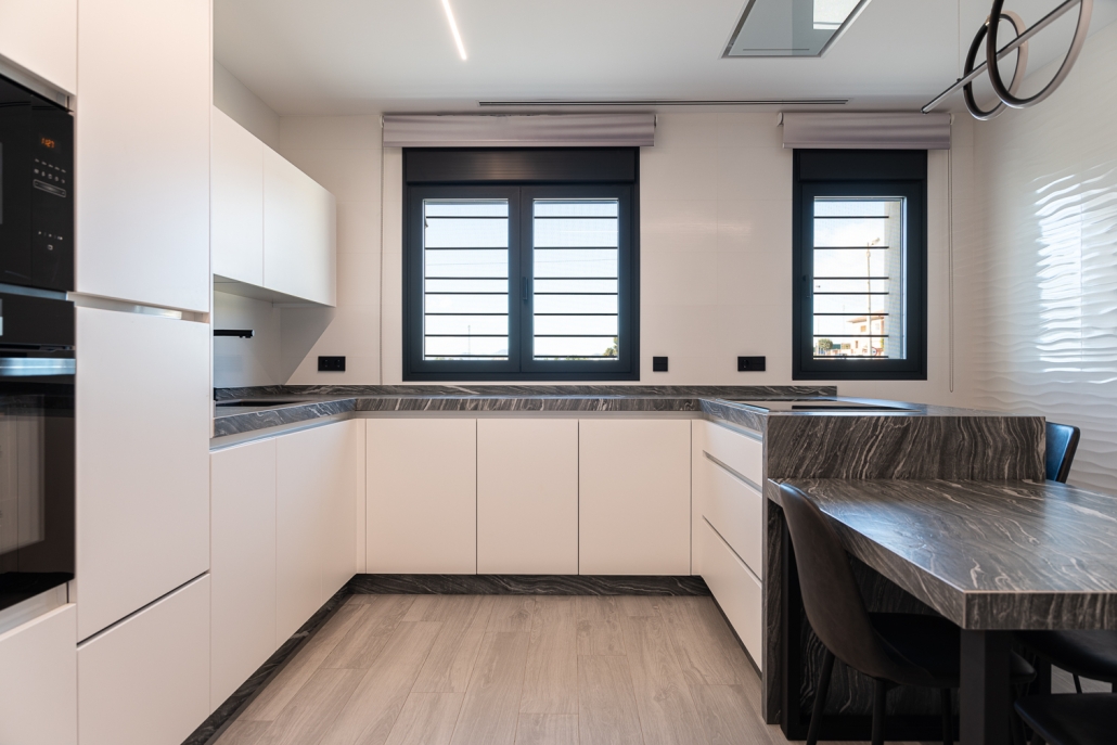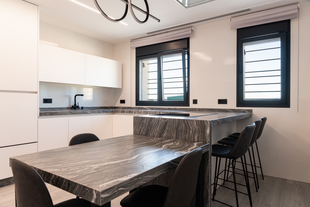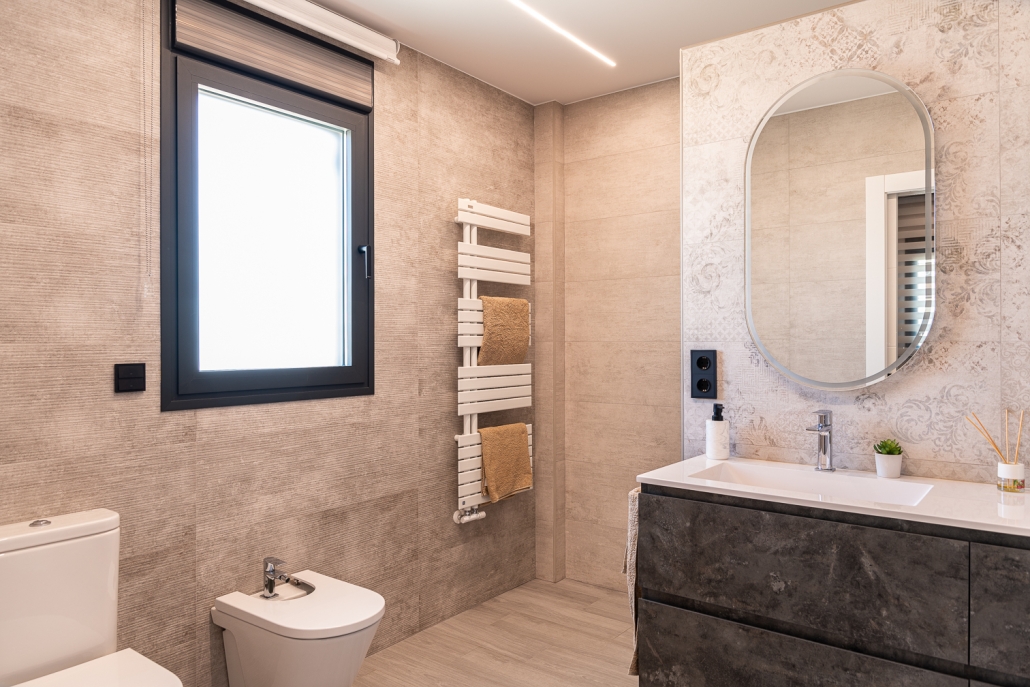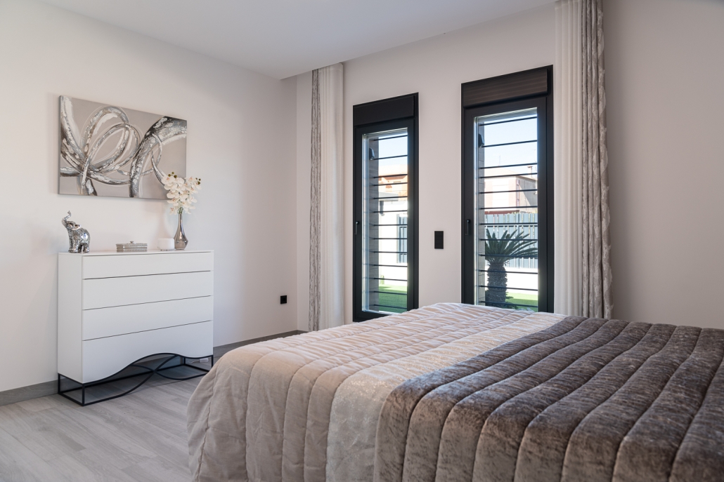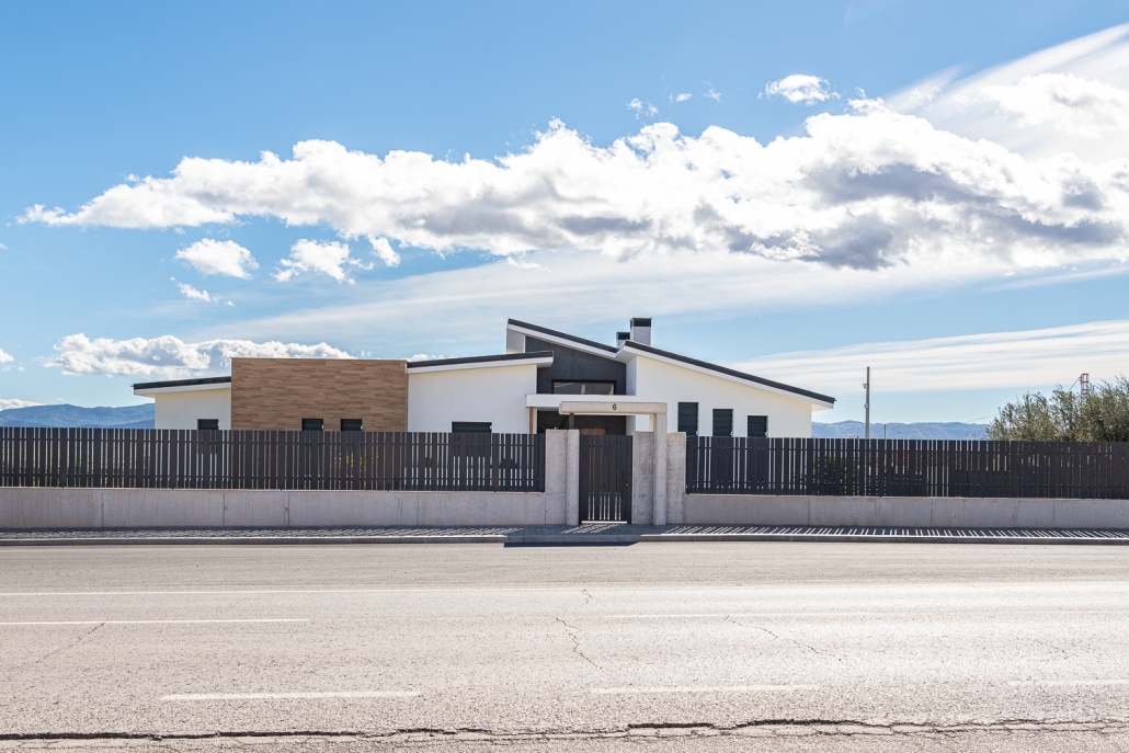 Este llamativo chalet de formas actuales cuenta con unas instalaciones de calidad, entre las que destacan sus cerramientos de PVC.